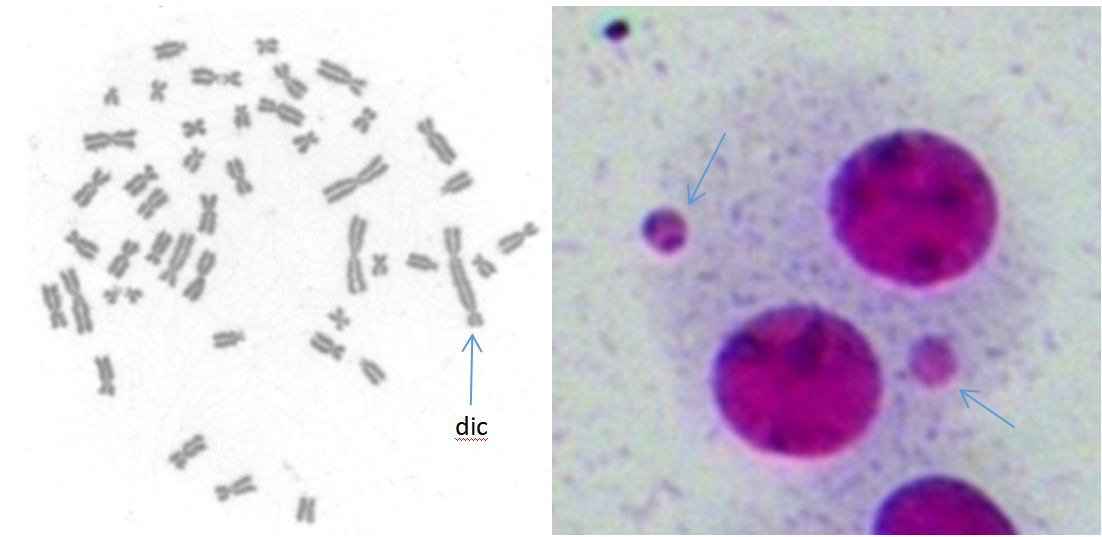 含有1个双着丝粒染色体的细胞和含有两个微核的双核淋巴细胞
