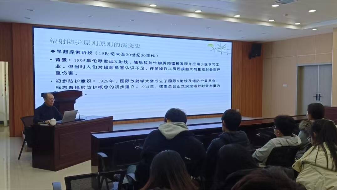 第一期讲座特别邀请在放射医学领域享有盛誉的邓大平研究员作为主讲人。讲座中邓大平以“放射防护的发展”为核心,结合自身多年的研究和实践经历,深入浅出地阐述了放射诊疗技术和放射防护的理论、技术发展历程等。邓大平研究员通过生动的案例分析、翔实的数据展示和清晰的逻辑推导,将复杂的专业知识讲解得通俗易懂,让同学们对放射防护有了更为全面和深入的理解。