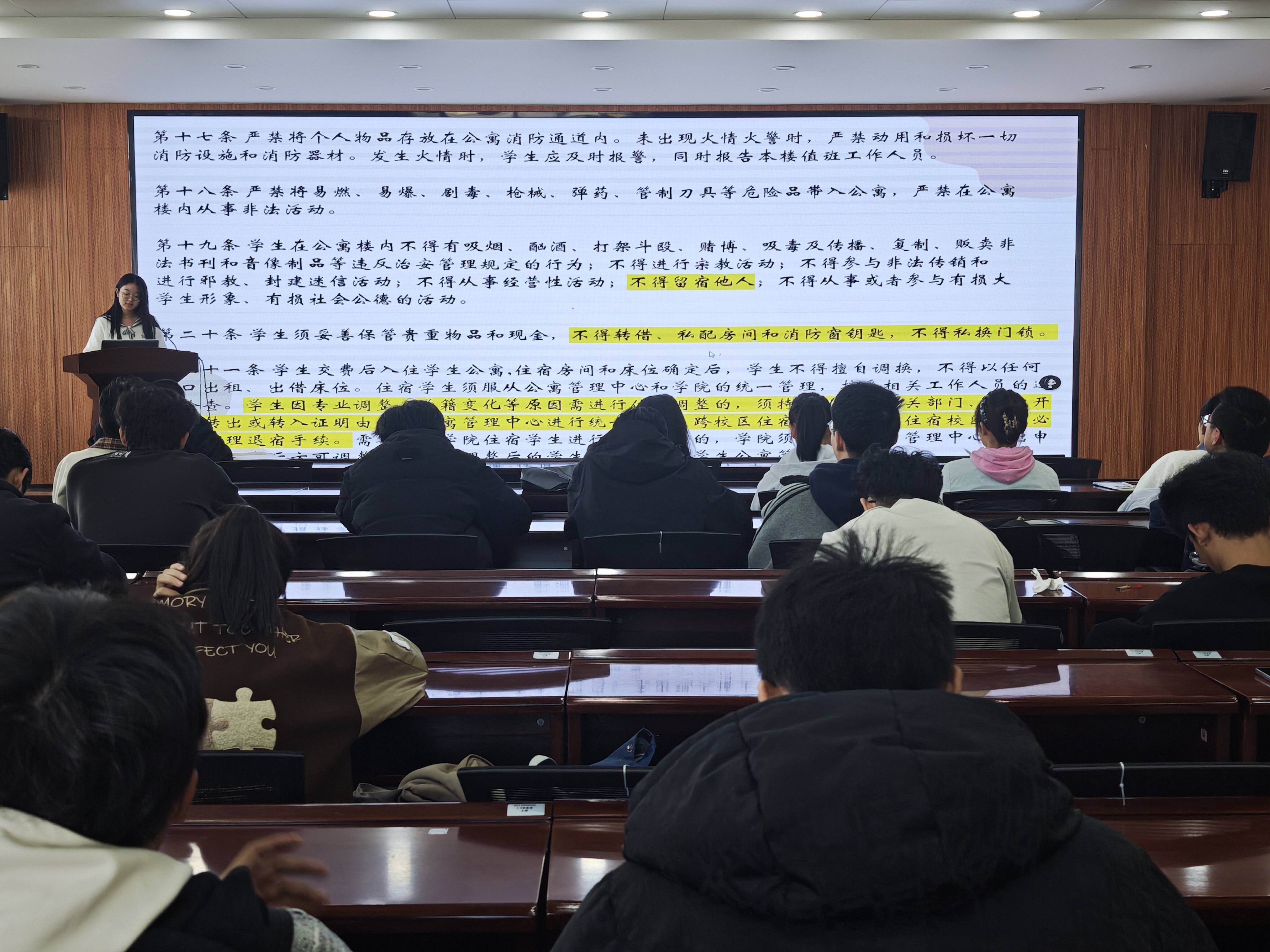 生活与纪律委员姜婷同学重点讲解了《员工公寓管理办法》,强调消防安全与秩序维护要求,明确禁止违规用电、使用明火、私拉电线等行为,提醒同学们保持宿舍整洁,共同维护安全有序的住宿环境。