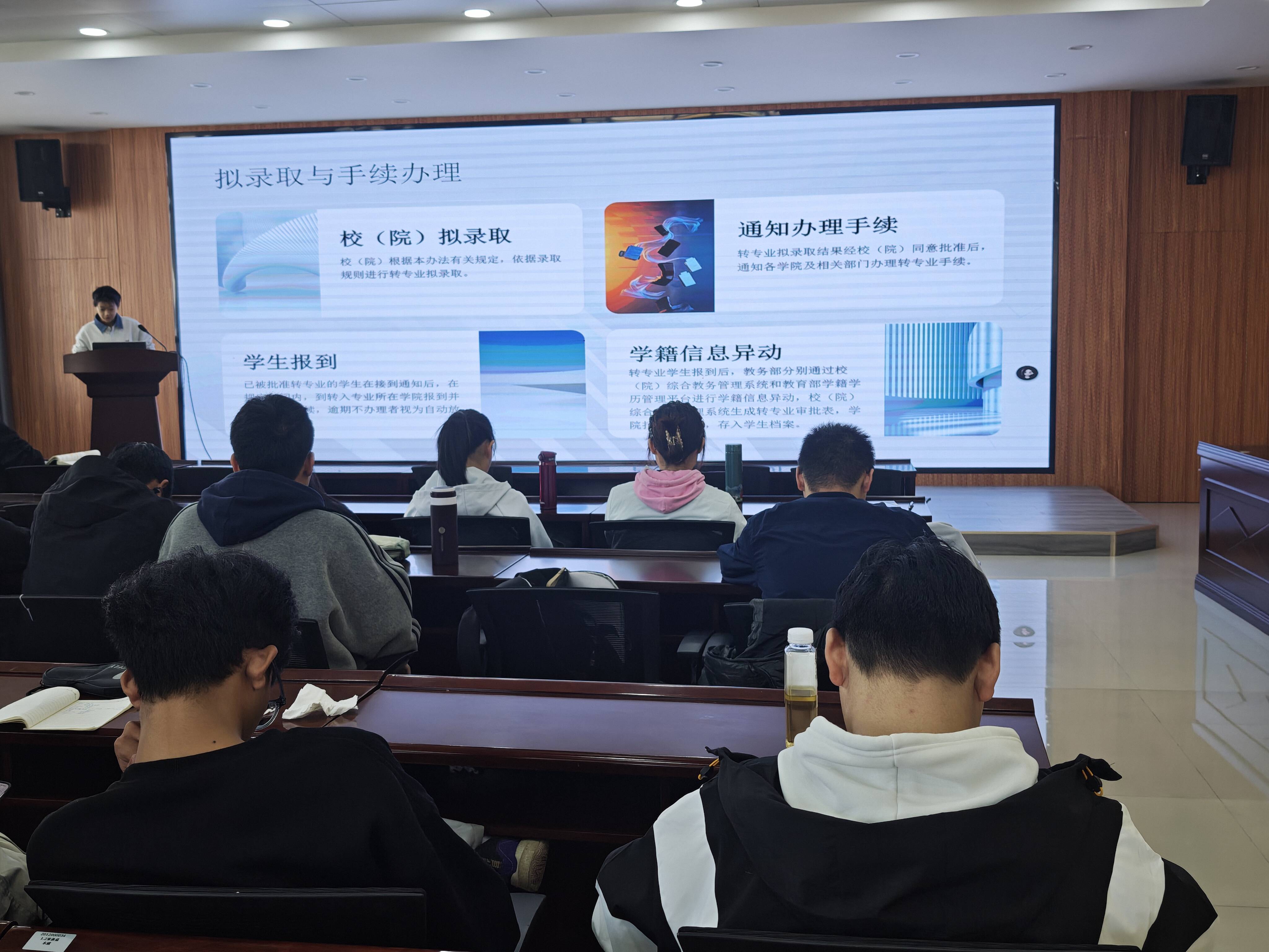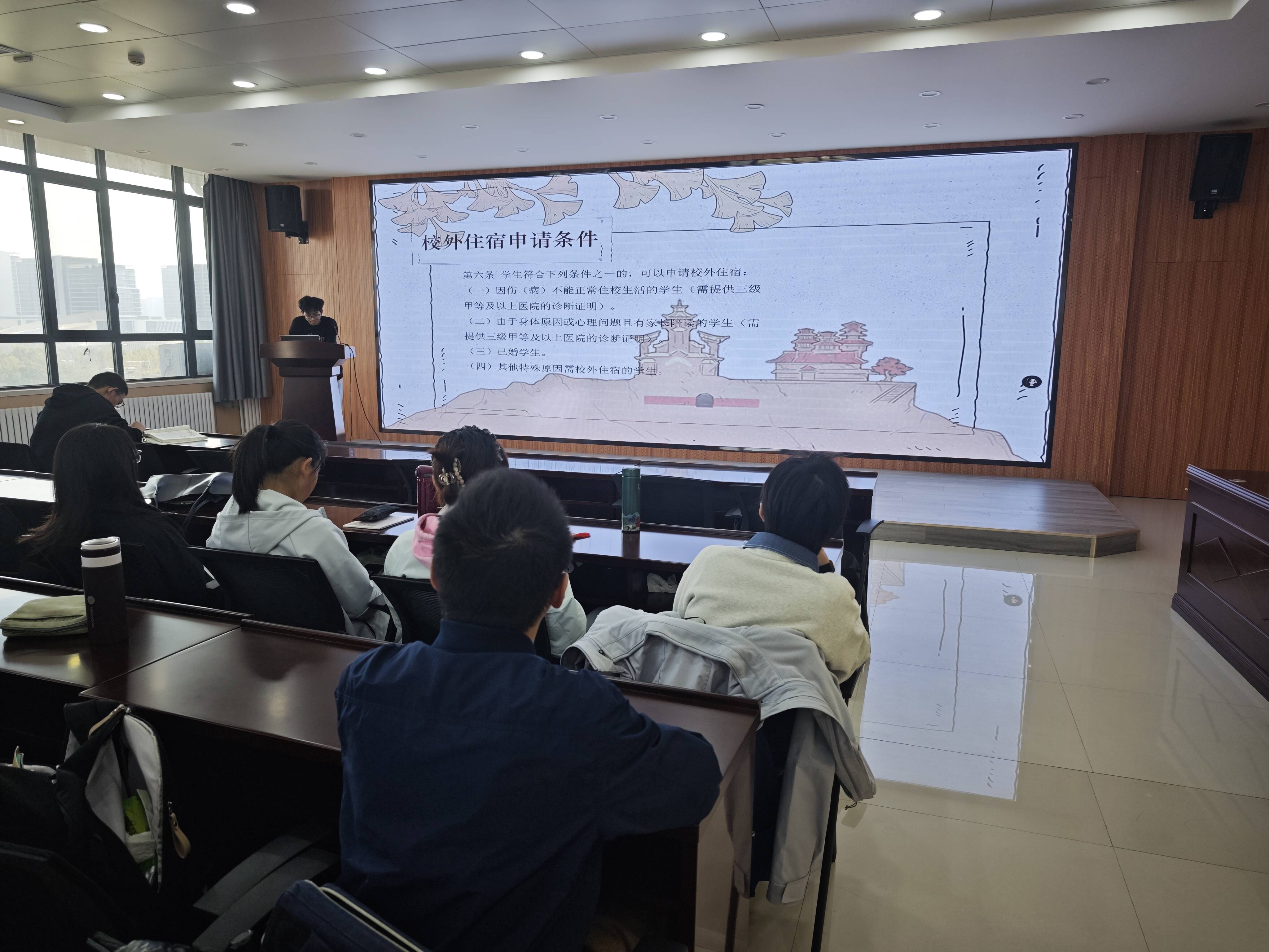 此外,文艺与体育委员董庆博同学与学习委员刘小萱同学还就转专业、校外住宿等问题进行解读,详细说明了转专业的申请条件、成绩要求、实施程序,以及校外住宿的适用情形、审批流程与员工责任义务,帮助同学们准确把握政策细节。