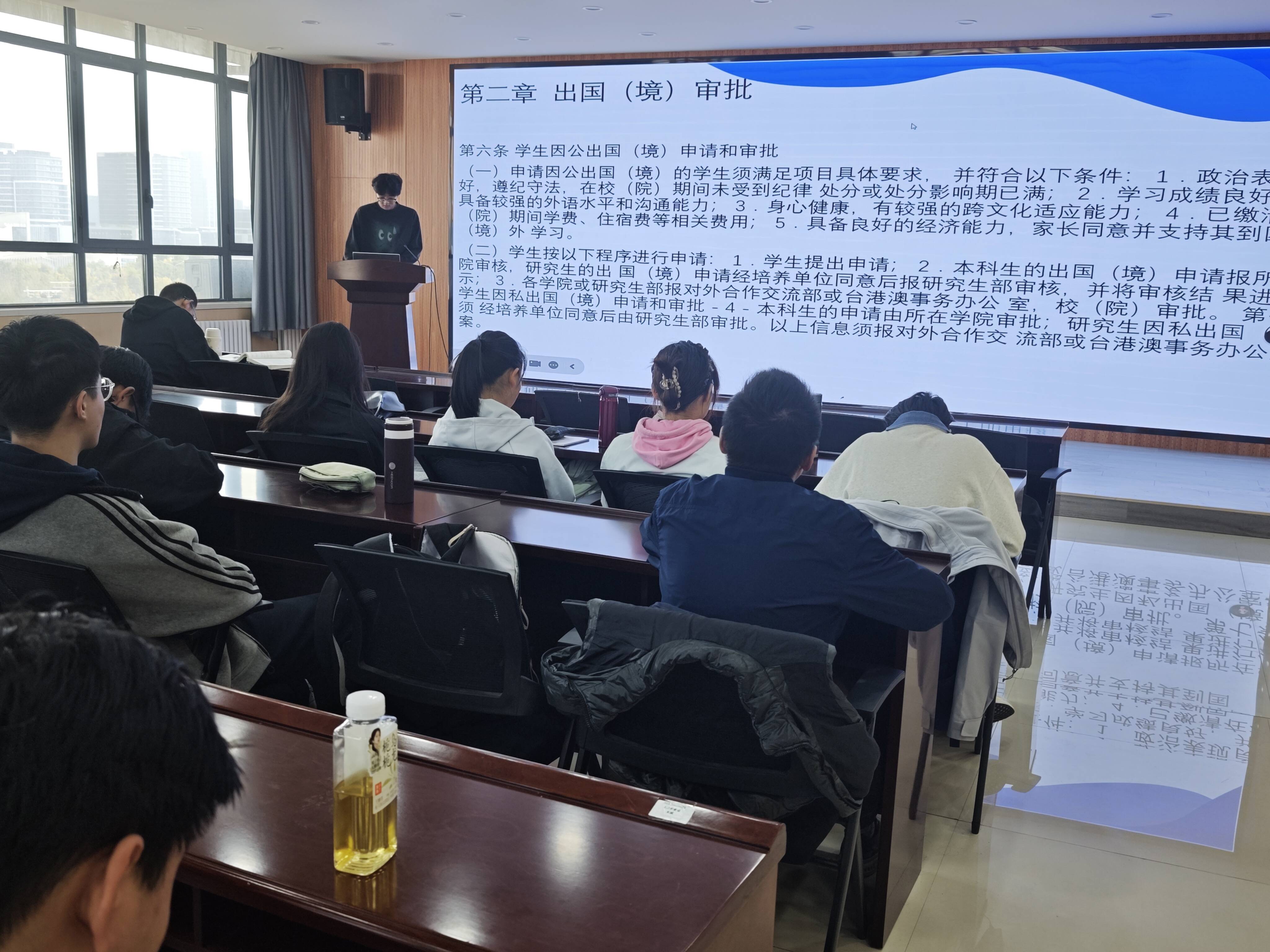 宣传委员杨子谦同学详细介绍了因公、因私出国(境)的审批流程、学籍学分管理及相关注意事项,建议同学们选择教育部认可的境外院校,确保交流学习过程合规顺畅。