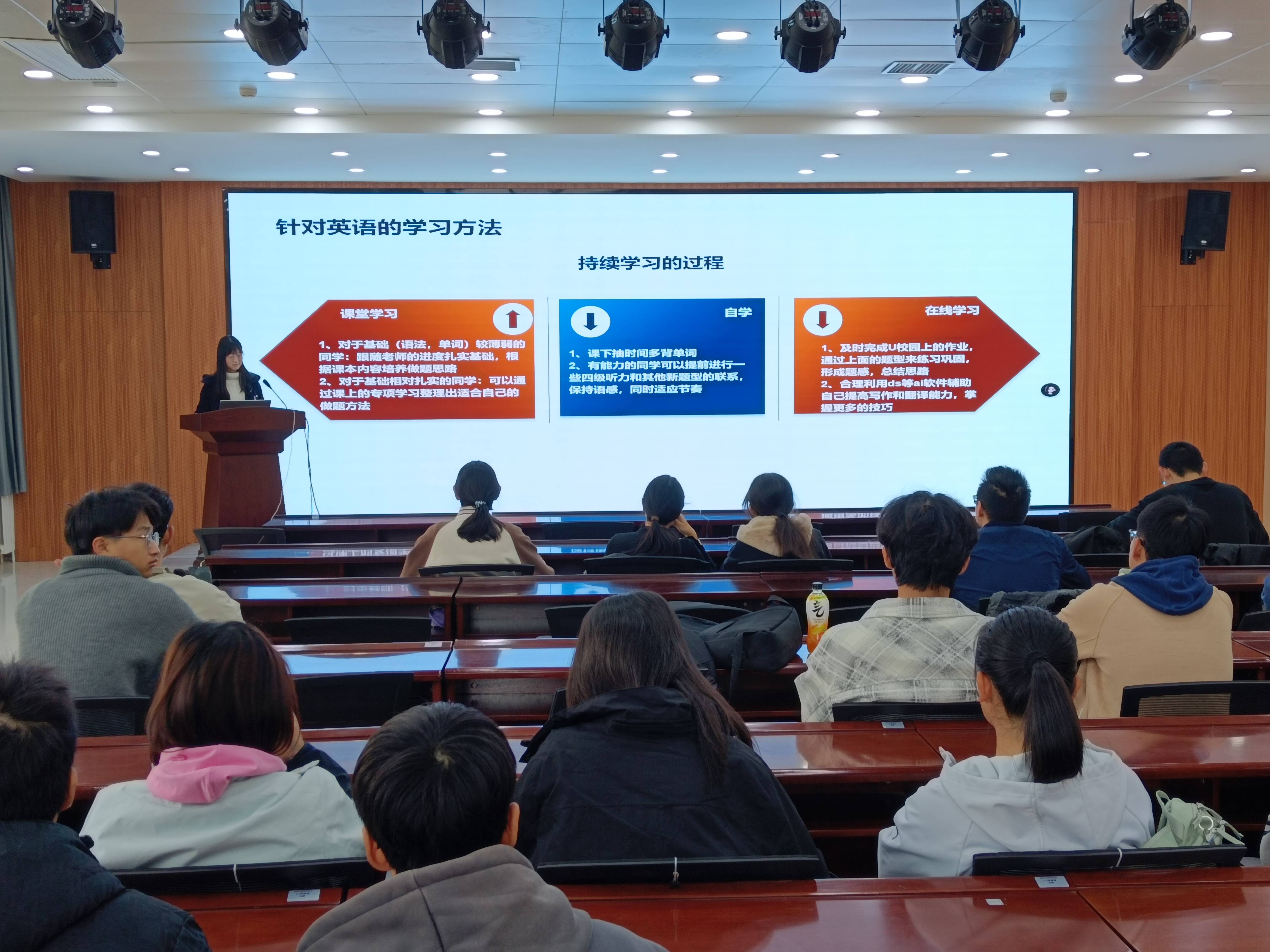 王姝涵同学针对同学们在课堂上、自主复习及面临期末周备考等方面的问题,详细分享了在课堂学习、课后复习、期末巩固的高效学习方法,并且结合自身经验,分享了通过课堂、自学与线上的持续学习英语方法。