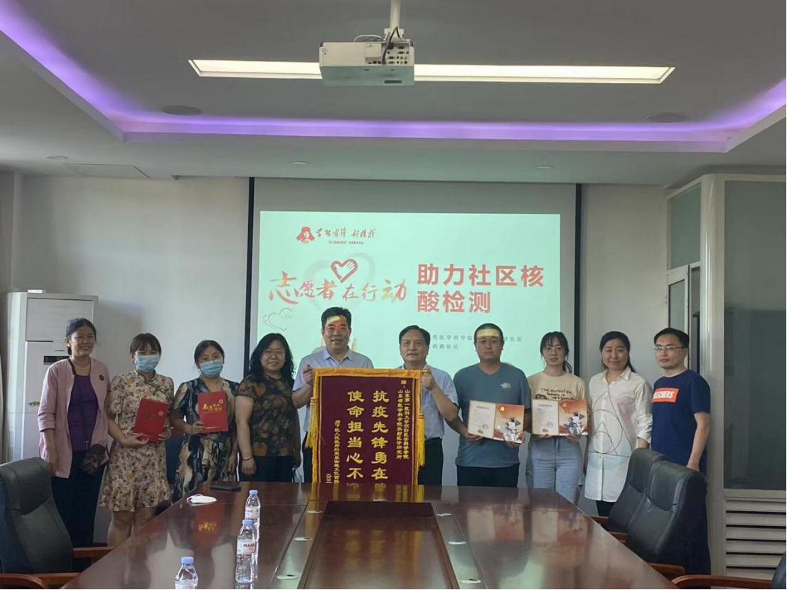 2022年5月30日,济南市历下区趵突泉街道办事处人大工作室主任武怀亮、趵突泉街道文化西路社区党委书记李建华、网格员姚秀芸,专程将一面印有“抗疫先锋勇在前 使命担当心不负”的锦旗送到mk体育,对院(所)志愿服务队在社区核酸采样中给予的大力支持和鼎力相助表达诚挚的谢意。