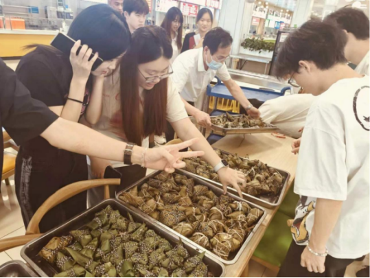 6月8日,院(所)在秋实苑和谐餐厅开展了包粽子活动。活动伊始,常务副院(所)长朱建国现场示范了包粽子的过程,随后师生们一起分工合作,将粽叶挽成漏斗状,填上糯米、馅料,扎绳,再封口捆扎,巧手翻飞,将节日的祝福包裹进一个个饱满可爱的粽子中。活动现场还开展了投壶游戏,现场欢声笑语,洋溢着浓厚的节日氛围。